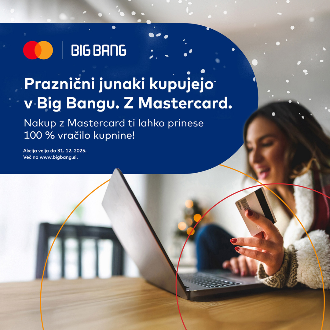 V sklopu akcije “Praznični junaki kupujejo v Big Bangu. Z Mastercard.” lahko vsi, ki do 31. 12. 2025 opravite nakup z Addiko kartico Mastercard v trgovinah Big Bang ali na bigbang.si, sodelujete v žrebu za vračilo celotne kupnine.